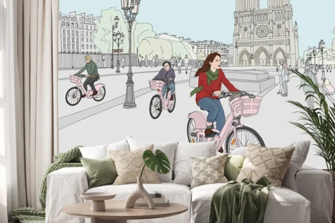Naklejka: Scena miasta paryża. kobieta lubi jeździć na rowerze po mieście,