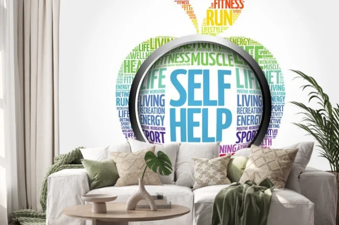 Self Help apple word cloud ze szkłem powiększającym, zdrowie koncepcja.