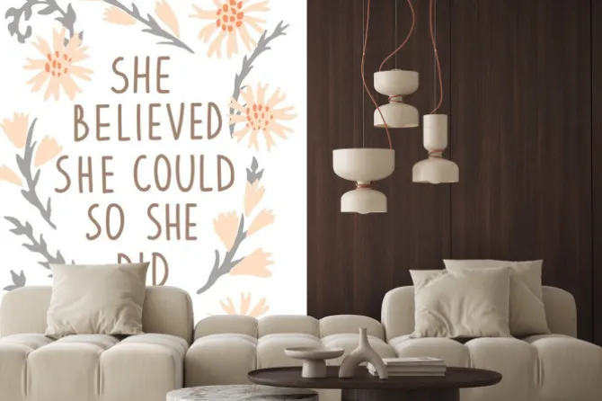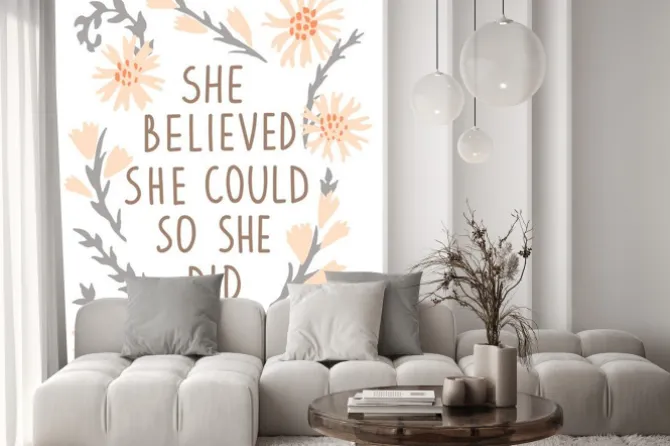 She Believed She Could So She Did. Inspirational vector quote poster. Floral composition in pastel colors with lettering.