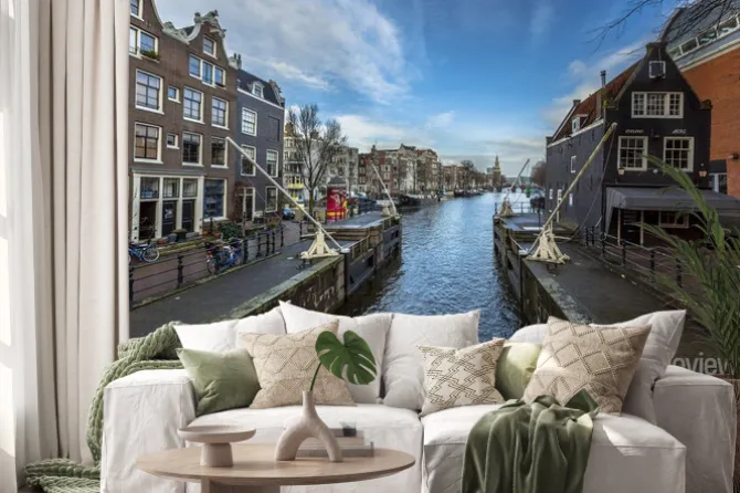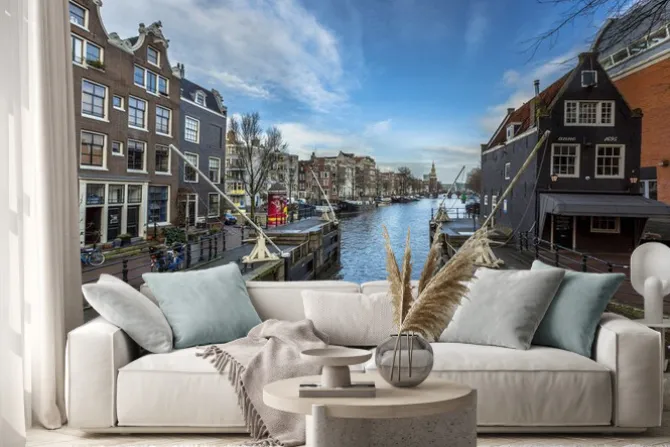 europa, Amsterdam, miasta, ulice, drzewa, niebo, architektura, rzeka