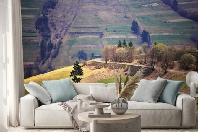 Naklejka: Słoneczny wiosna w górskiej miejscowości. pól i wzgórz