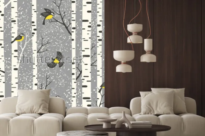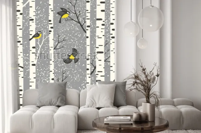 Naklejka: Śnieżni brzoz drzewa, ptaki na szarym tle i. połączony wektor