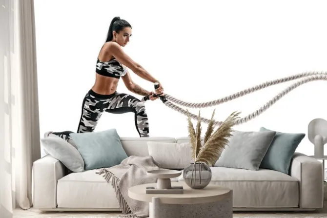 Naklejka: Sportowy kobieta trening z ciężkimi arkanami. fotografia sporty