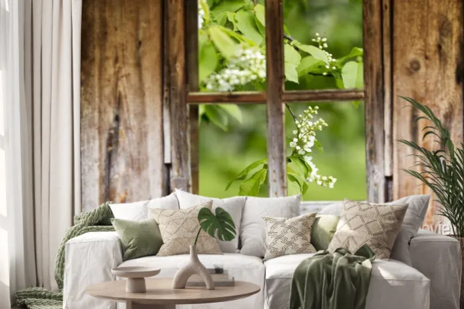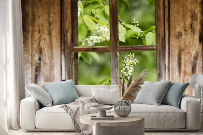 Naklejka: Stare drewniane ramy okienne, wiosna, kwitnące drzewa.