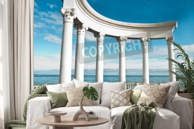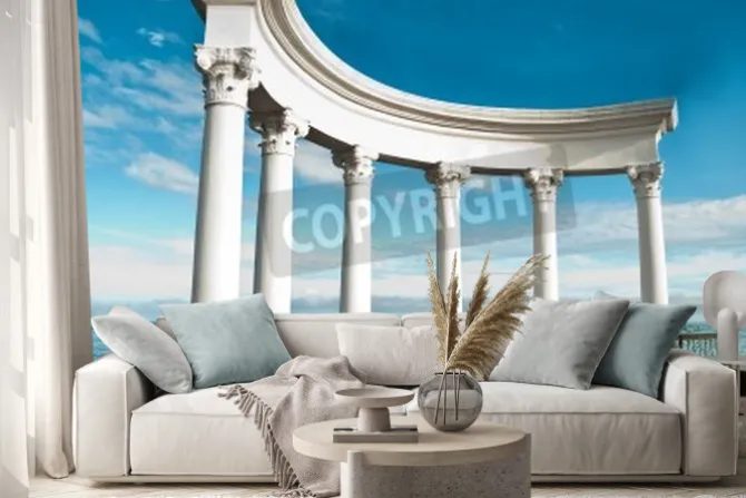 Naklejka: Starożytne greckie kolumny na tle błękitnego nieba i morza