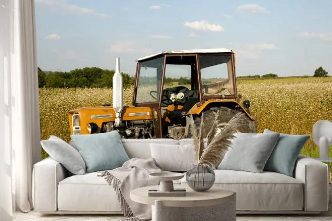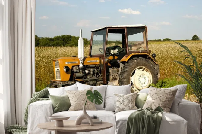Naklejka: Stary traktor pracujący na wiejskim polu