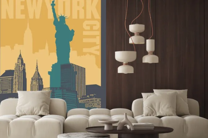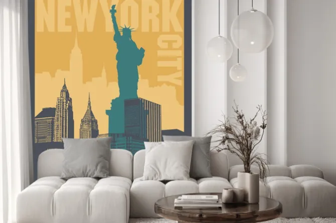 Naklejka: Statua wolności i budynki nowego jorku w stylu plakatowym