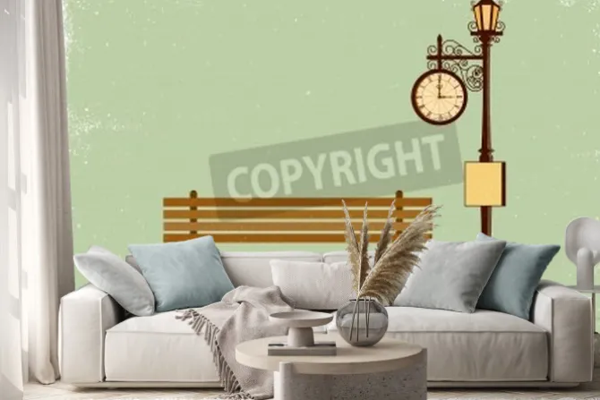 Naklejka: Street clock and lamp post with park bench in vintage vector