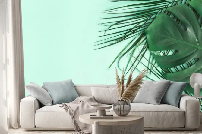 Naklejka: Summer composition. palm leaves on mint background. summer concept.