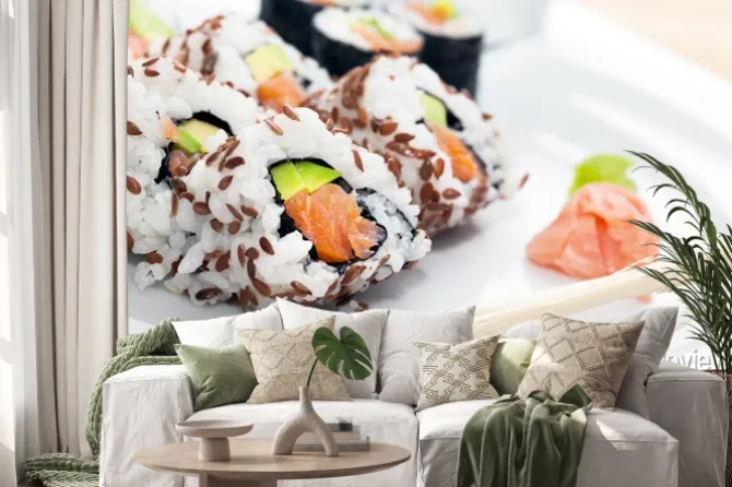 Sushi z łososia, awokado, ryż w wodorostów podawane z wasabi i imbir..