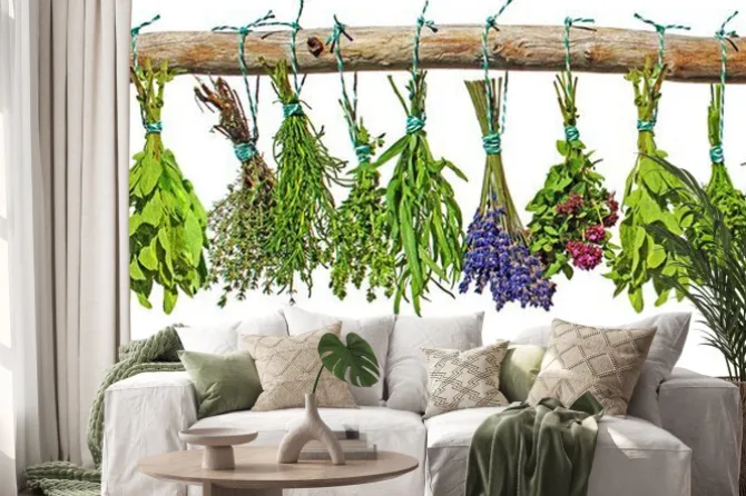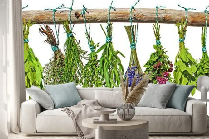 Naklejka: Suszone zioła kuchenne wiszące na drewnianej gałęzi