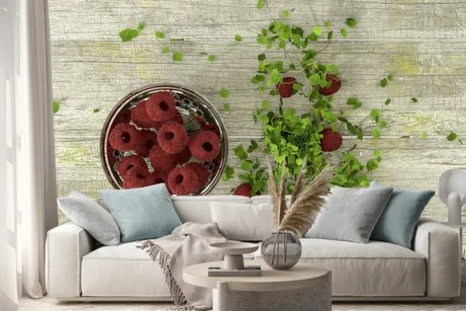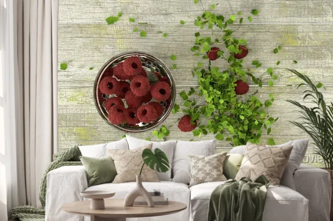 Naklejka: Świeże maliny w ozdobnym szklanym jelita