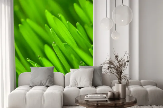 Naklejka: Świeże zielona trawa pszenicy z kropli rosy / makro