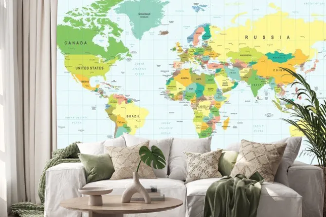 Naklejka: Szczegółowa kolorowa mapa świata z siatką geograficzną