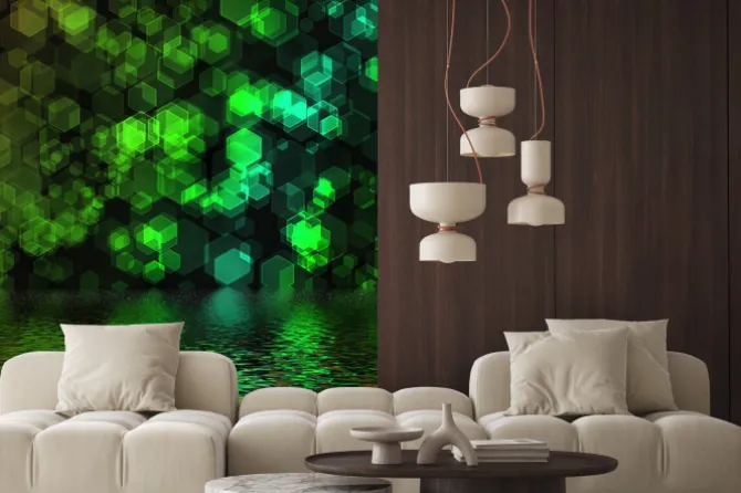 Naklejka: Sześciokąt bokeh zielone tło odzwierciedlenie w powierzchni wody.