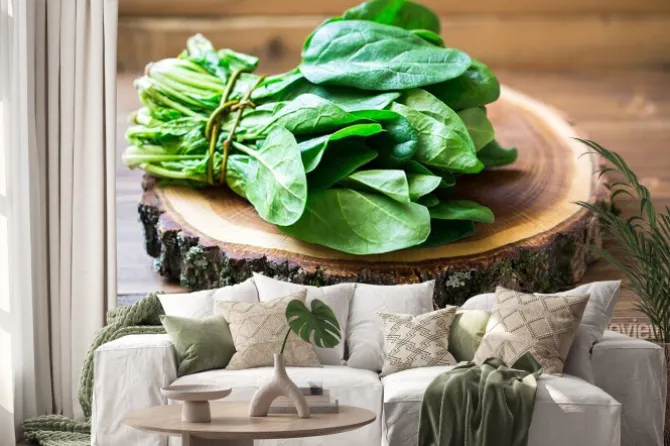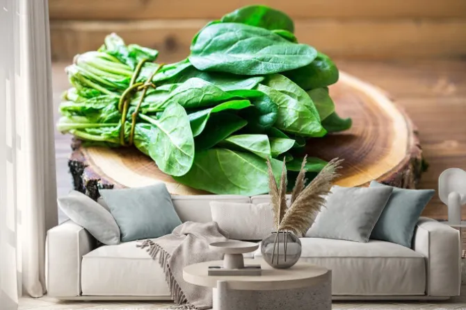 Naklejka: Szpinak liście na drewnianym kole