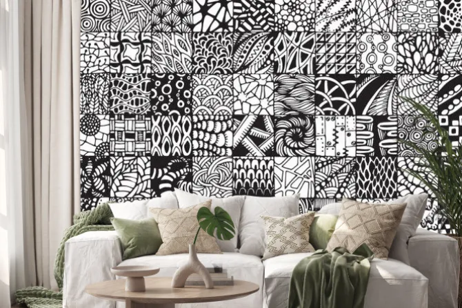 Naklejka: Tekstury z czarno-białych kwadratów malowane w stylu zentangl