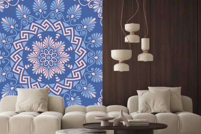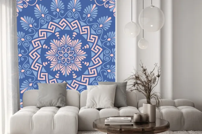 Tradycyjne rocznika bez szwu różowy, biały i niebieski okrągły kwiatowy ornament grecki, Meander.