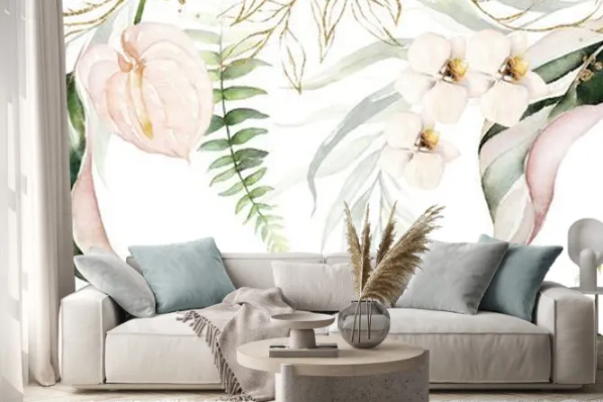 Tropikalne akwarelowe rośliny i kwiaty.
