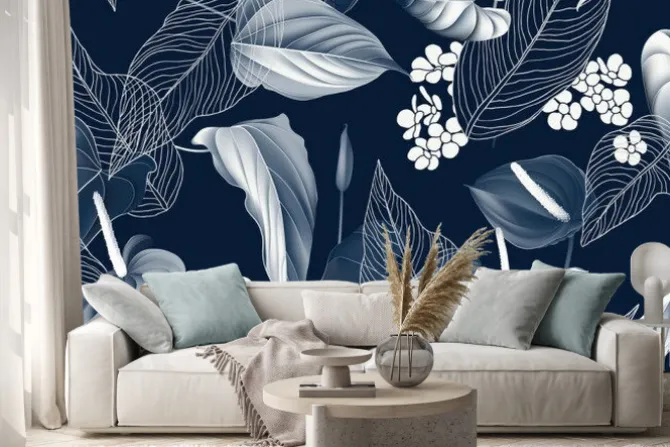 Naklejka: Tropikalne liście i kwiaty na granatowym tle