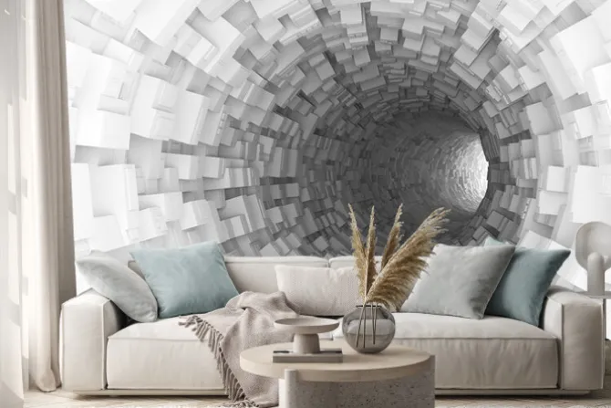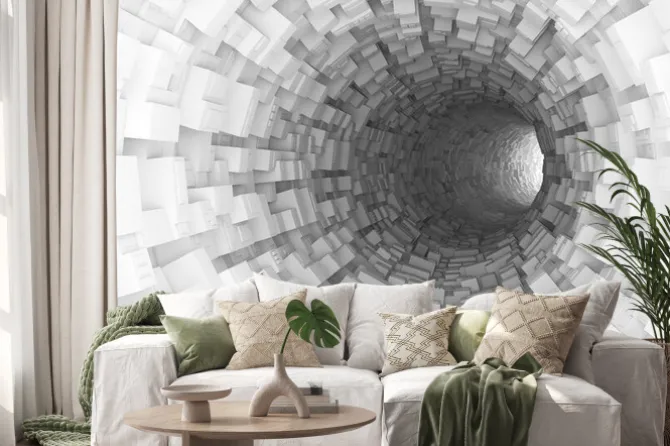 Tunel 3D z białych prostokątnych brył.