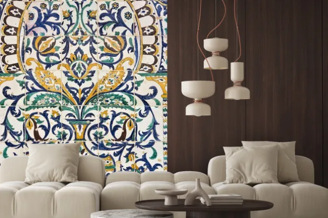 Tunezja. Kairouan – w Zaouia Sidi Saheb. Fragment ceramiczne kafelki panelu z motywami kwiatowymi i architektonicznych.