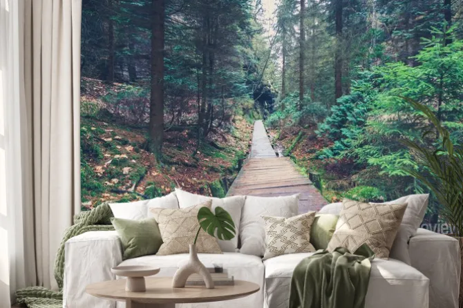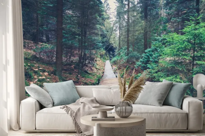 Naklejka: Wędrówki ścieżką wewnątrz krajobrazu leśnego