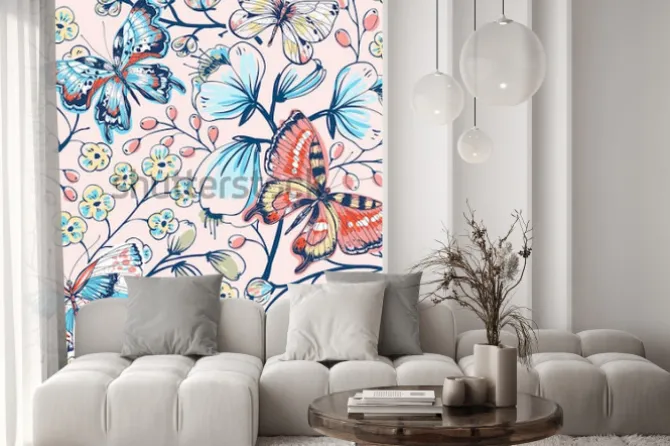 Naklejka: Wektor kwiatowy wzór z rocznika motyle i kwiaty