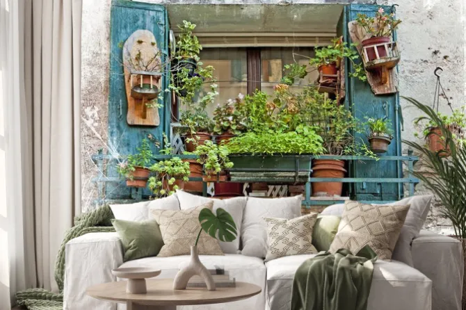 Naklejka: Wenecja, stare małe okienka z roślinami