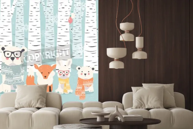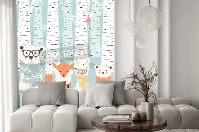 Naklejka: Wesoło bożych narodzeń pocztówka z niedźwiedziami, lisem i królikiem