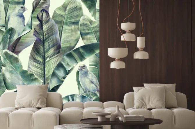 Naklejka: Wzór z liści bananów i egzotycznych ptaków na delikatnym beżowym