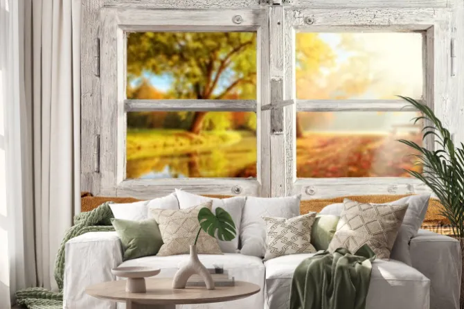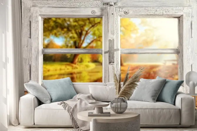 Naklejka: Zabytkowe drewniane okna overlook jesienne drzewa