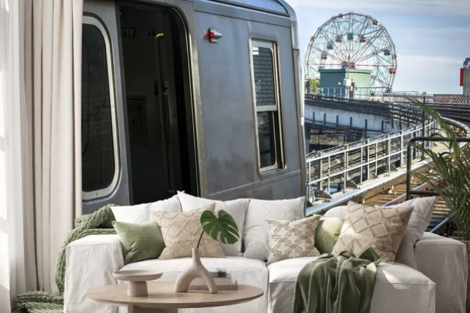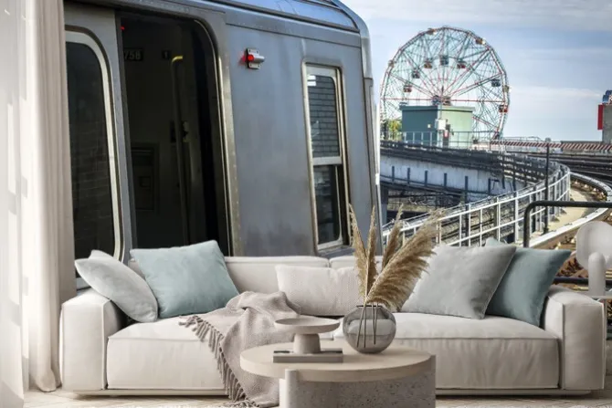 Zatrzymano pociąg na wzniesieniu z widokiem na stacji metra Coney Island w Nowym Jorku.