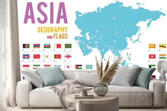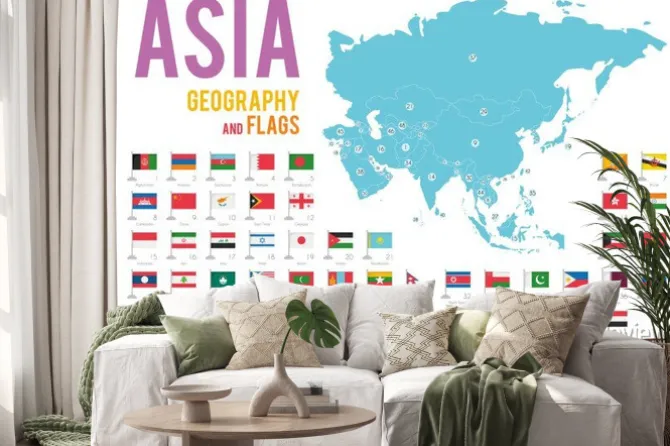 Naklejka: Zestaw 50 flag azji na białym tle i mapę azji z krajów znajdujących