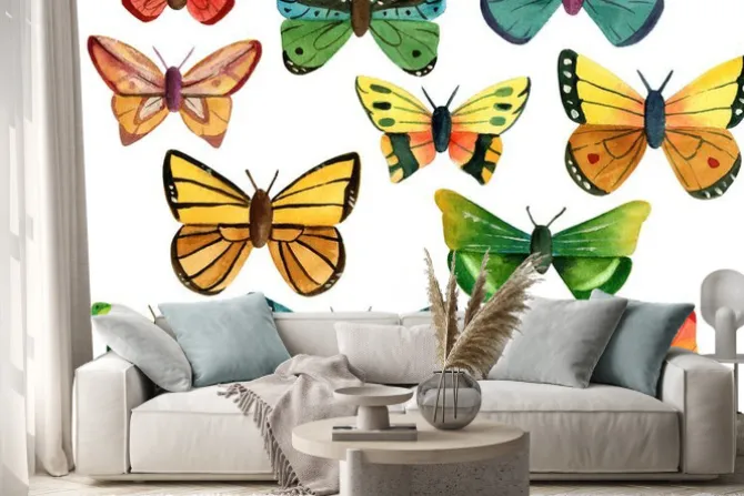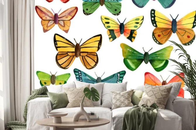 Naklejka: Zestaw wielu różnych motyli akwarela na białym tle