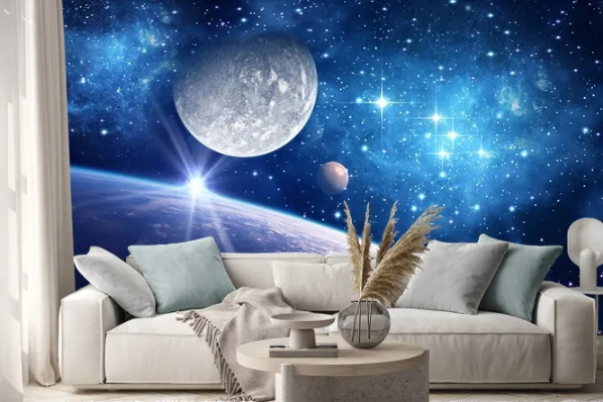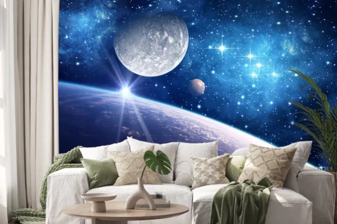 Naklejka: Ziemia i księżyc w gwiaździstym kosmosie