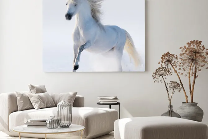Obraz: Biały koń galopujący po śniegu