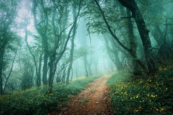 Obraz: Las we mgle tajemniczy krajobraz
