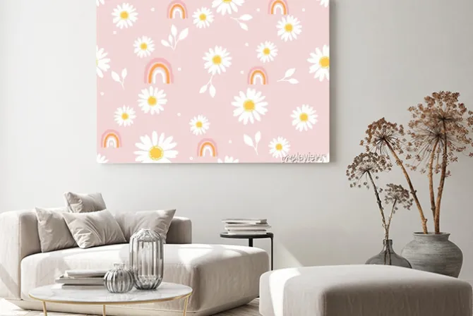 Obraz: Tęcze i stokrotki na różowym pastelowym tle