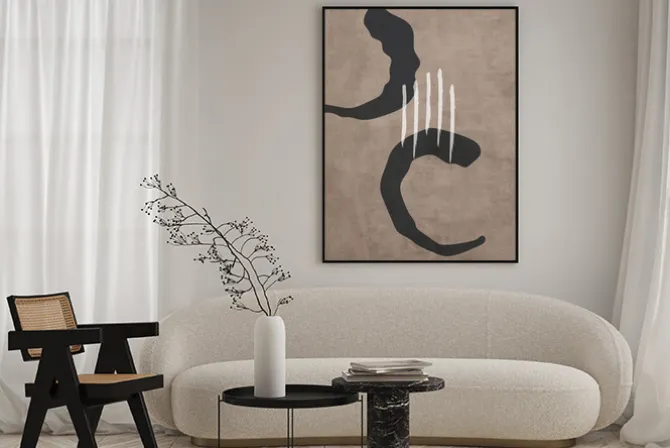 Abstrakcyjne czarne i białe kształty na beżowym tle.