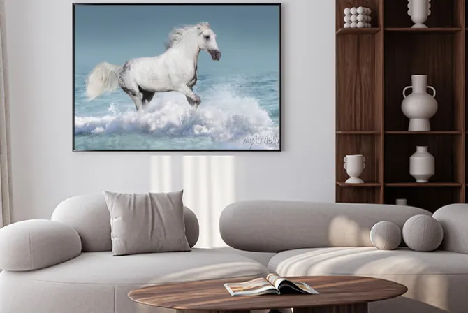 Plakat: Biały koń arabski prowadzony galop w fale w oceanie