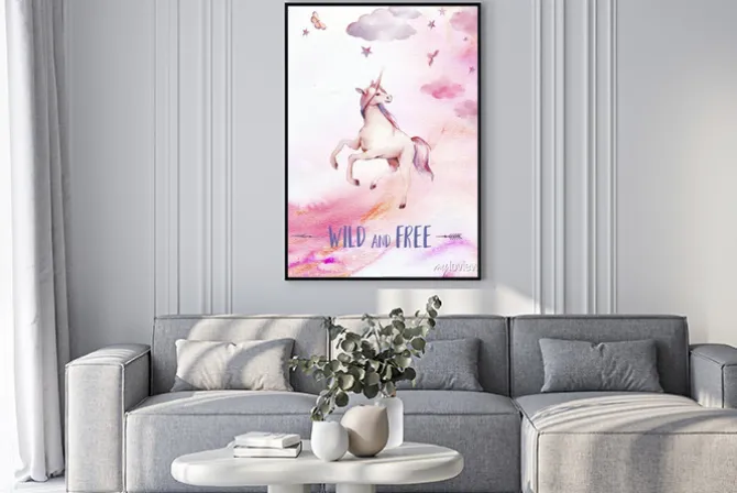 Plakat: Dziki i wolny. akwarela jednorożca plakat. ręka malująca baśni