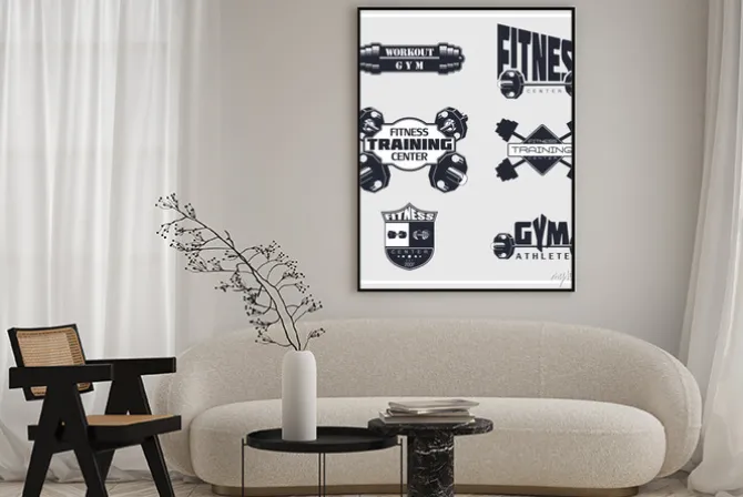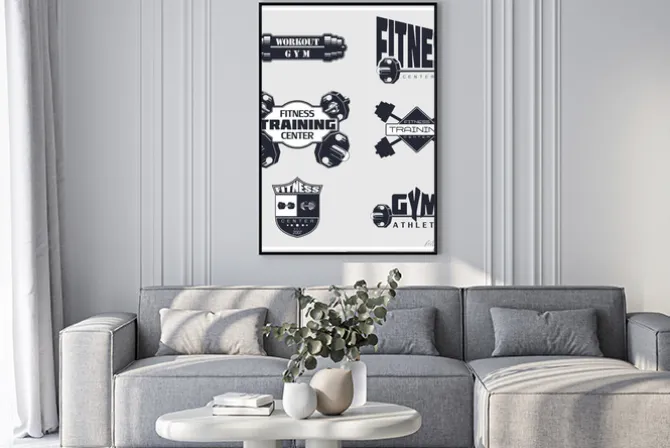 Plakat: Fitness, siłownia, emblematy kulturystyki