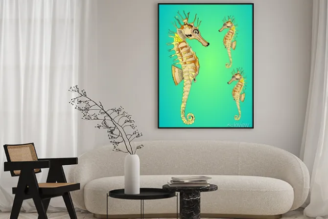Grafika z konikami morskimi.