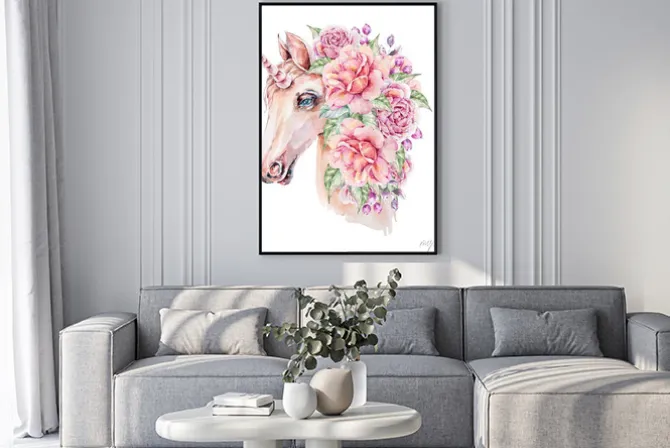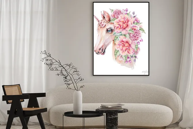 Plakat: Jednorożec z kwiatami na głowie malowany akwarelą