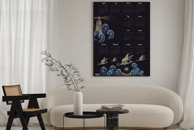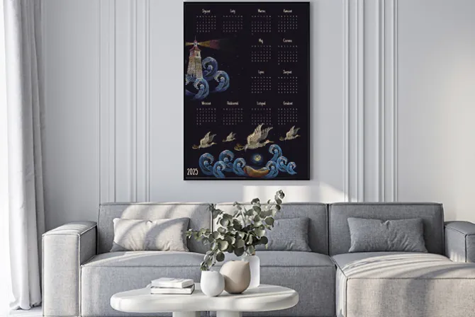 Kalendarz w ciemnych barwach z latarnią morską i ptakami.