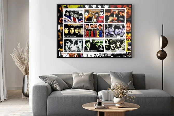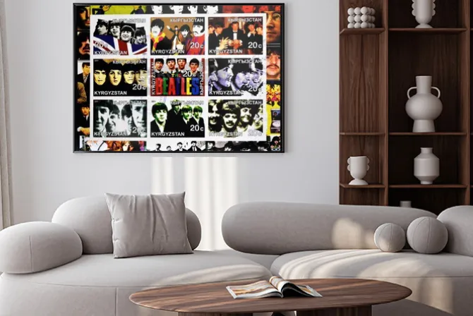KIRZIGUISTAN – OKOŁO 2001 Kolekcja znaczków wydrukowanych w Kirziguistan pokazuje Beatles, circa 2001.