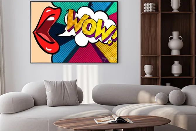 Kolorowa grafika pop art z ustami i napisem WOW.