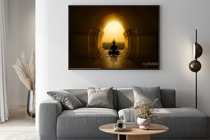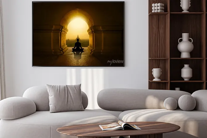 Plakat: Medytujący mnich w buddyjskiej świątyni