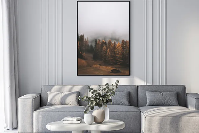 Plakat: Mgła nad jesiennym lasem krajobraz